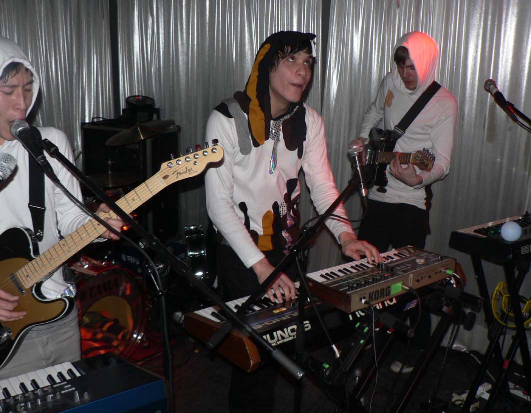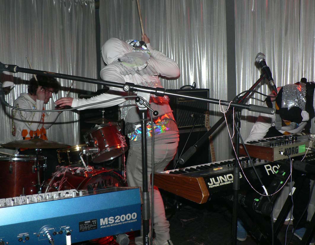 Daher musste auch kurzfristig eine Lokalband als Vorgruppe einspringen: Die Weitgereisten hatten kein Schlagzeug dabei. Nach der Vorband, die ihre wöchentliche Probe einfach ins Tsunami verlegt hatte und danach netterweise das Schlagzeug stehen ließ, kamen die Jungspunde So So Modern in ihren grotesken self-made Anzügen auf die Bühne: Weiße Kapuzenanzüge, die ebenso an Devo wie an Chicks on Speed erinnern. Darin stecken ziemlich junge und sehr euphorische Menschen mit offensichtlichem ADHS-Syndrom. Das äußert sich sowohl in körperlichem Überschwang als auch in ihrer Musik. Die ist nämlich sowas von wechselhaft, brüchig, galoppierend – im positivsten Sinn – das man bestimmt nicht nur beim spielen seine Schwierigkeiten bekommen kann, sondern alleine beim bloßen zuhören. Eine New Wave-Zickigkeit, die sich im abgehakten, schrillen Gitarrensound, Synthie-Gefiepse und beim Gesang zeigt. Bei So So Modern wechseln aber nicht nur die Parts sehr schnell, sondern sie wechseln meist gleich die komplette Stimmungslage: Von euphorischen Popmomenten über Noiseausbrüche zu spacigen Auswüchsen. Und live wechseln sie auch mal das ganze Referenzsystem. Auf New Wave beziehen sie sich dann nämlich ebenso wie auf hippieseke Musikformen, die durch eine 60’s-Orgel heftig assoziiert werden, ohne bei Blondie zu landen. Außerdem wird Funk hier groß geschrieben und bildet das verbindende Element zwischen New Wave und Sixties-Sound. Letzteres lässt dem Publikum immer wieder kleine Verschnaufspausen. Das war auf den Orkan allerdings vorbereitet, hatten nicht wenige der Anwesenden die Band kurz zuvor als Vorband von Robocop Kraus gesehen (So So Modern touren seit Ende September in Europa und haben sich so eine stetig wachsende Fangemeinde erarbeitet. Der Umzug nach London oder Berlin ist also nur noch eine Frage der Zeit). Die Luftballons der Band wurden also mit Konfetti gekontert. Tja, wenn der Kölner Karneval mit solcher Musik aufwarten würde, könnte man mich vielleicht doch noch bekehren …