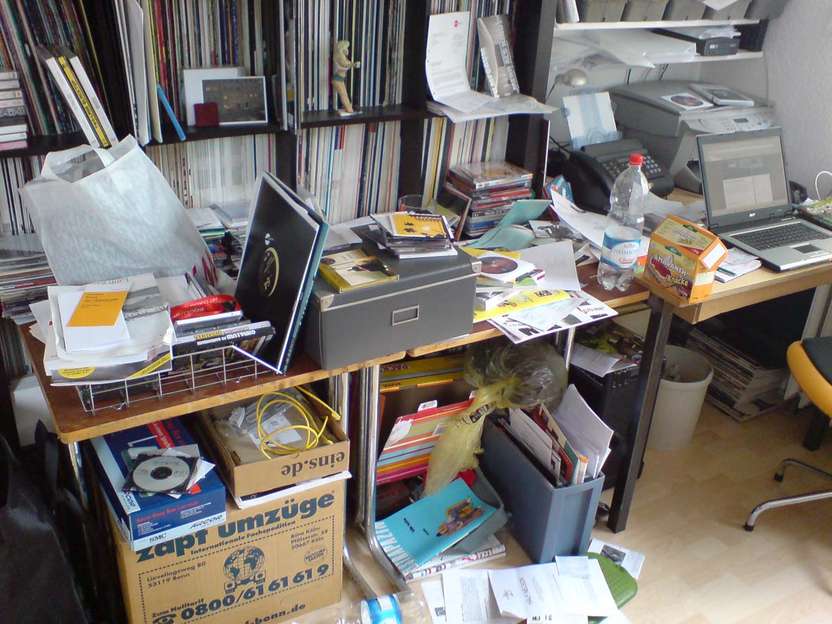 1. versteh ich nicht – wo soll da was mit messie sein? Sieht alles reichlich systematisch und arbeitssam aus. Nur Nasskämmer glauben, Ordnung sei ein Synonym für leerer Tisch.